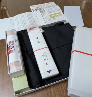 届いた箱を開けると、専用の輪袈裟、頭陀袋、名札……。これまでの歩みが形になったようで、2巡目は家族のためになりました。
